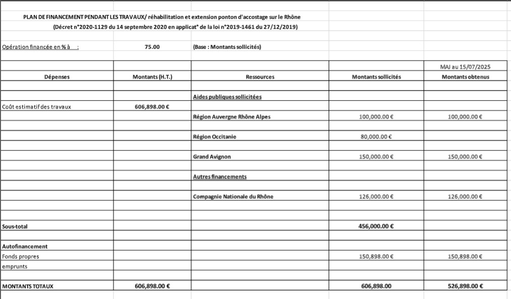 Ces différents critères ont permis à notre commune de solliciter et de bénéficier de l’aide la région Auvergne Rhône Alpes, de la Région Occitanie, du Grand Avignon et de la Compagnie Nationale du Rhône. Les montants obtenus sont portés dans le plan de financement prévisionnel qui suit.
